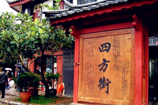 四方街是丽江古城心脏,交通四通八达,周围小巷通幽,据说是明代木氏土司按其印玺形状而建。这里是茶马古道上最重要的枢纽站。明清以来各方商贾云集,各民族文化在这里交汇生息,是丽江经济文化交流的中心。这里是历代集市中心,每日万头躜动,热闹非常。从四方街四角延伸出四大主街,直通东南西北四郊,又从主街岔出众多街巷,如蛛网交错,往来畅通。街道全用五彩石铺砌,平坦洁净,晴不扬尘,雨不积水。几乎每条街道一侧都伴有潺潺流水。由此形成以四方街为中心,四周店铺客栈环绕,沿街逐层外延的稠密而又开放的格局,古老的集市就这样孕育了城市最初的形状,这与中国传统的四四方方的井字形街道是不是一样的。