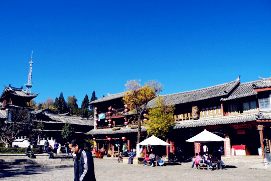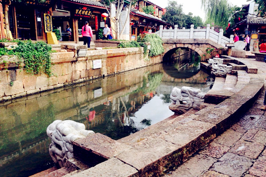 四方街幽深的街巷,青石铺就的道路两边,所有的房屋全是砖木结构。门窗栏栋、斗拱飞檐大都雕刻着花鸟虫鱼、飞禽走兽的花纹。这城市本身就是座公园,小桥流水、树木花朵。耳闻玉笛铜萧的悠扬,或黄鹂栖翠柳的鸣唱;它与中国古代那种普遍的有城墙的城市不同;除了木王府四周有围墙外,丽江是中国唯一不设防的古城。人们可以从四面八方通过街道、小路、巷子、田野甚至山上的羊肠小道进入这个城市。四方街丽江是一个日日夜夜和淙淙流水相约的城市,就像威尼斯那样。不过大研镇的水道,是经过设计用人工挖掘的。原始的河流只有一条,就是穿城而过的中河,从中河又人工开发出西河和东河,分为三支,像一棵大树的主干和两个支干。从它们又生出无数的小渠。居民们甚至可以直接饮用这泉水。四方街是一个梯形的小广场,建造时被设计得中间稍微凸起,两边凹下,犹如一片巨瓦。