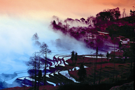 麻栗寨景区梯田面积大、壮观、线条美、立体感强。从海拔1100米的麻栗寨河起,连绵不断的成千上万层梯田,直伸延至海拔2000米的高山之巅,把麻栗寨、坝达、上马点、全福庄等哈尼村寨高高托入云海中。站在麻栗寨茶厂观梯田,近万亩的梯田宛如一片坡海,泛着粼粼波光,奔来眼底,景色十分壮观,每当下午四时后,白茫茫的坡海随着夕阳西下,逐渐变成粉红色、红色。再转变成粉红色、白色。是观赏和拍摄梯田随时光变化而变化的地方。哈尼族村落风光奇丽,民风敦厚,村民待客十分热情。